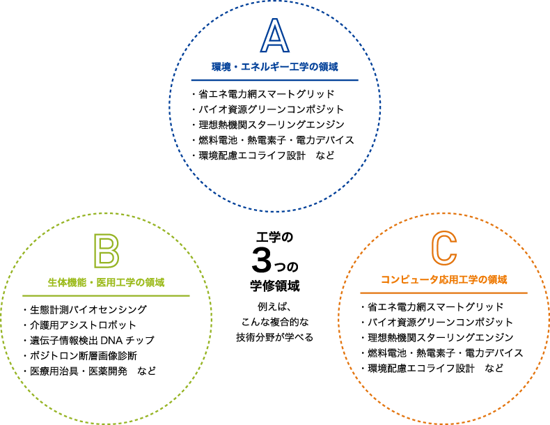 例えば携帯電話ひとつにも機械、電子、情報、数学、物理、化学と多彩な技術が応用されているように、高度情報化社会の技術者には他分野と連携できる知識や視野が欠かせません。